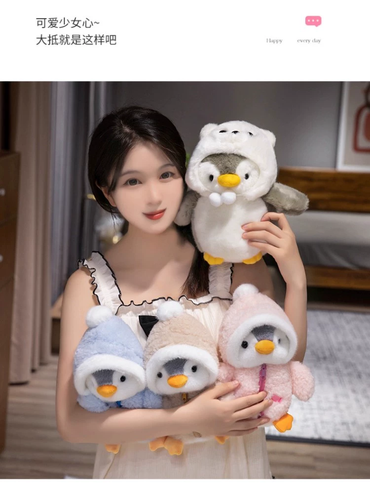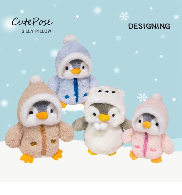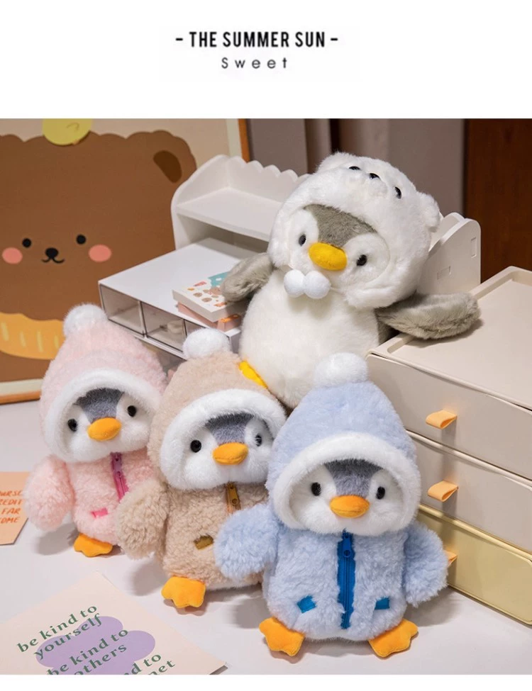 Blue penguin, Brown penguin, Light grey penguins, Pink penguin