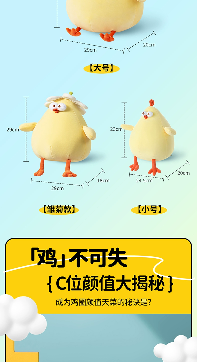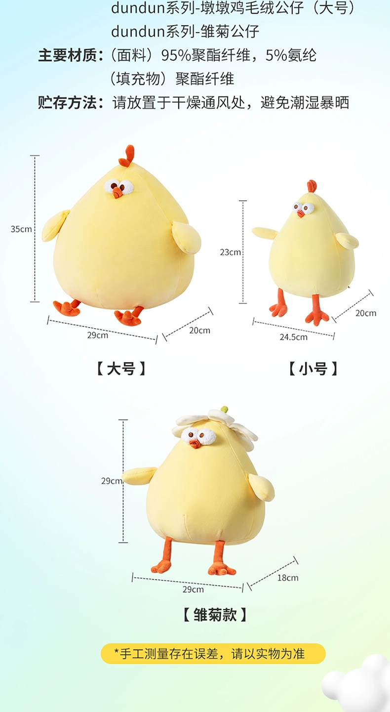 11 inch vegetable chicken doll (cauliflower chicken), 14 DUNDUN Chicken Drumsticks Doll, dundun Chicken Plush Doll – Large size 29x35cm, dundun Chicken Plush Doll – Small size 24x23cm, dundun chicken series – fried chicken doll 27x26cm, Dundun Chicken Series – No. 6 Coconut Chicken Doll